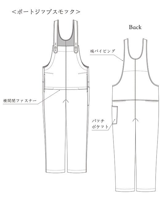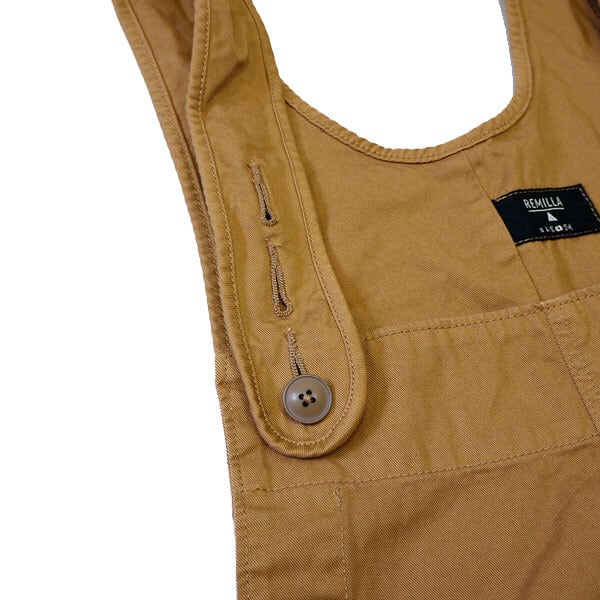 ショルダーストラップのボタンホールでサイズが調節可能で、フロント側の脇線と後身切替にそれぞれスラッシュポケットと、左脇に1つパッチポケットが付く5ポケット仕様で、"ボートジップ"と名付けられた横開きのジップ(社会の窓)がremillaならではの特徴です。